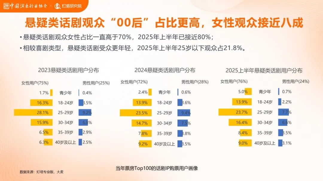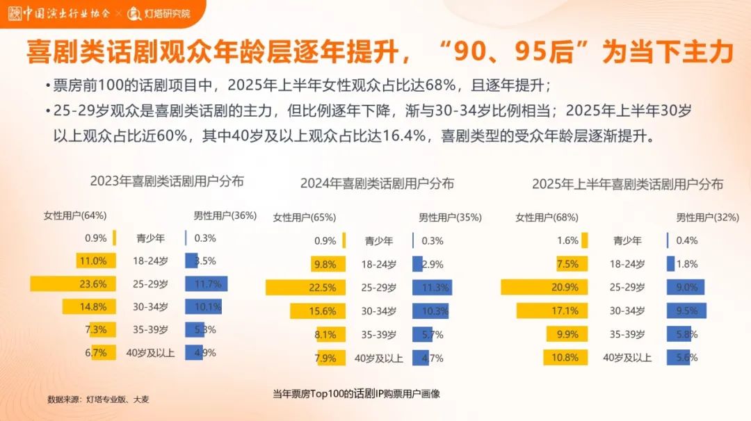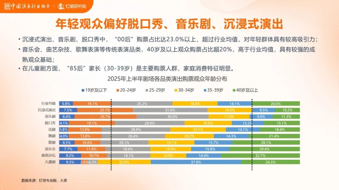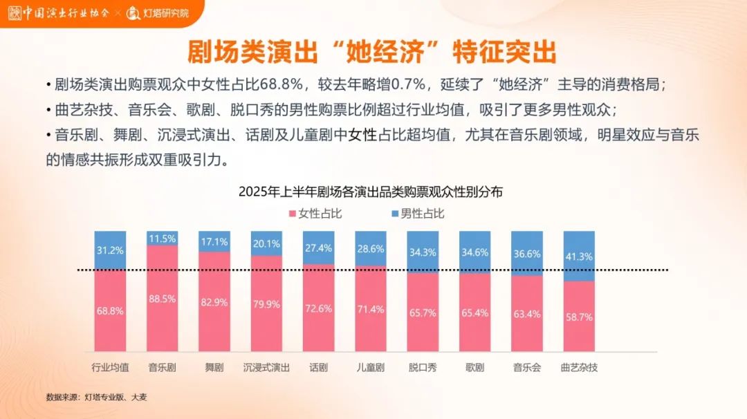 在消费趋势方面,剧场类演出购票观众中女性占比68.8%,较去年略增0.7%,延续“她经济”主导的消费格局,尤其在音乐剧、舞剧、沉浸式演出、话剧及儿童剧中女性占比超均值。