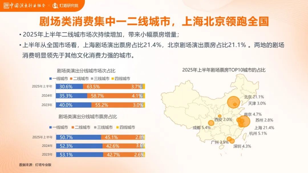2025年上半年,话剧保持在所有演出品类中的优势地位,场次同比增长16%,票房同比增长3%,《出马》《戏台》《太白金星有点烦》等项目受到市场追捧;脱口秀由于在专业剧场演出场次激增,带动脱口秀整体票房显著增长,演出场次同比增长54.1%,票房同比增长134.9%,已成剧场类演出第二大品类;舞蹈演出市场整体趋稳,票房小幅增长,精品舞剧持续发挥市场引领作用,《只此青绿》《红楼梦》《天工开物》《孔雀》等保持较高热度,带动传统文化破圈传播效果显著;音乐剧市场增长持续,票房同比增长15.1%,原创音乐剧《锦衣卫之刀与花》《赵氏孤儿》等引起观演热潮,国际经典剧目引进加速,《巴黎圣母院》《日落大道》《芝加哥》等在巡演城市均以多场次赢得市场关注,以上海为唯一驻场演出地的音乐剧《SIX》,跨城观演比例达30.8%。