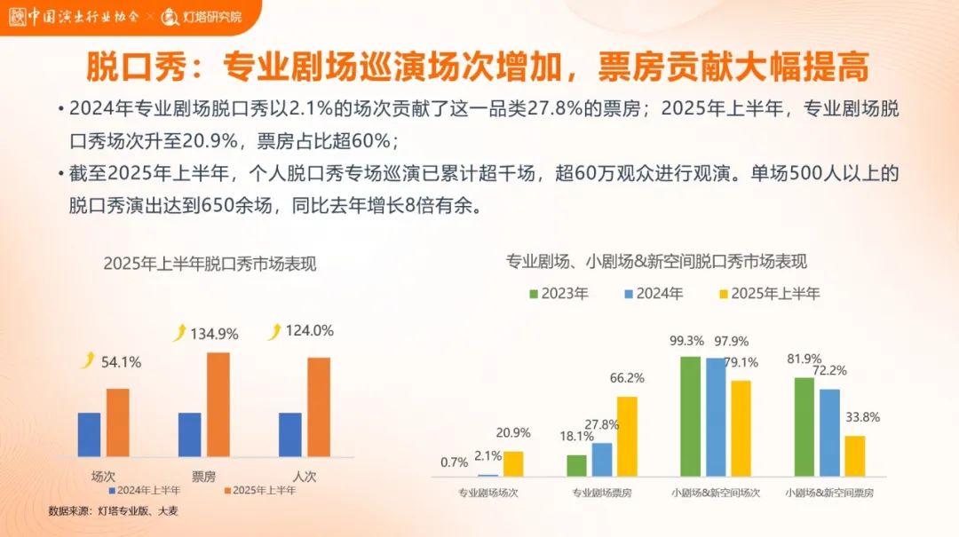 今日,中国演出行业协会联合灯塔研究院发布2025年上半年剧场热门项目和消费趋势洞察。据中国演出行业协会票务信息采集平台监测,2025年上半年专业剧场、小剧场新空间等剧场类演出16.05万场,票房收入54.02亿元,观众人数2055.01万人次;位列票房收入前200的剧场类演出IP(含小剧场和演艺新空间)场次、票房、观众人数较2024年同比均有显著提升。